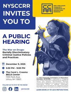 UTICA, NY, UNITED STATES, November 26, 2025 /EINPresswire.com/ -- The New York State Community Commission on Reparations Remedies (NYSCCRR) will continue its statewide series of public hearings with an in-person session on Tuesday, Dec. 9, 2025, from 5:30 p.m. to 9:00 p.m. at The Carol L. Crooms BECA Center, 1105 Park Ave, Utica, NY.The hearing will explore the theme: “The War on Drugs: Racially Discriminatory Criminal Justice Policies and Practices.” This session will focus on how decades of punitive drug laws, racial profiling, and unequal sentencing that devastated Black and Brown communities across New York State, fueling cycles of incarceration, economic instability, and intergenerational harm.